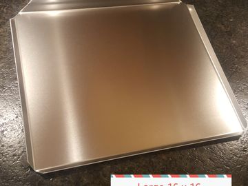 Our handcrafted baking sheets are made from food-grade aluminum which allows oven heat to transfer evenly across the baking sheet surface. They are made out of aluminium so they won't rust. The built-in handle allows for easy gripping when you take them out of your hot oven. They are also stackable, if you own more than one size, so they take up less room in your cabinet for storage. Another feature of the food-grade aluminum is how great they are for thawing frozen food, which can be done in a fraction of the normal thawing time. To clean them, just use soap and hot water. To keep their luster, avoid putting them in your dishwasher so they will continue to be nice and shiny for years to come.