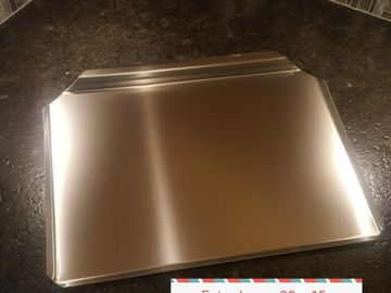 Our handcrafted baking sheets are made from food-grade aluminum which allows oven heat to transfer evenly across the baking sheet surface. They are made out of aluminium so they won't rust. The built-in handle allows for easy gripping when you take them out of your hot oven. They are also stackable, if you own more than one size, so they take up less room in your cabinet for storage. Another feature of the food-grade aluminum is how great they are for thawing frozen food, which can be done in a fraction of the normal thawing time. To clean them, just use soap and hot water. To keep their luster, avoid putting them in your dishwasher so they will continue to be nice and shiny for years to come.